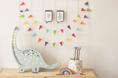 Además de su diseño único y su durabilidad, la lámpara de noche Dino Diplodocus impresiona por su tecnología LED de bajo consumo y su alta funcionalidad. La bonita lámpara en color Azul Prehistórico se adapta perfectamente a las necesidades del niño. La función regulable permite diferentes niveles de brillo para que la lámpara se pueda utilizar tanto como una suave luz nocturna como una luz de lectura. Para ahuyentar a los monstruos tímidos a la luz, la luz puede permanecer encendida toda la noche en modo atenuado. Alternativamente, la luz puede apagarse automáticamente después de 30, 60 ó 90 minutos pulsando el temporizador suministrado.